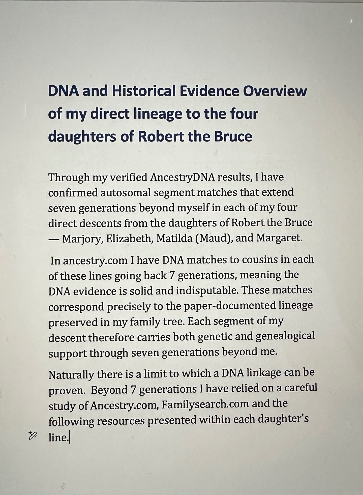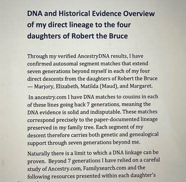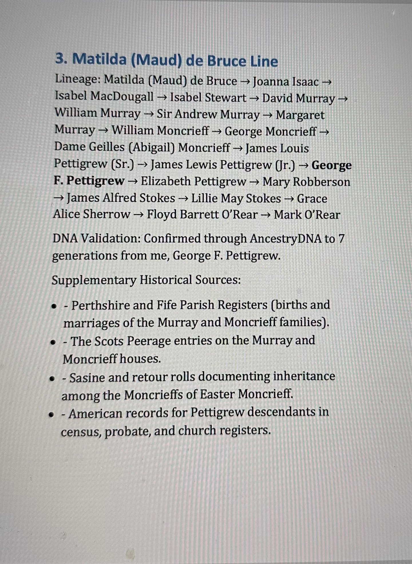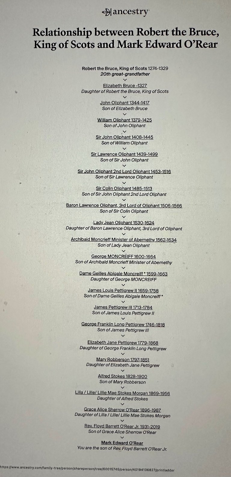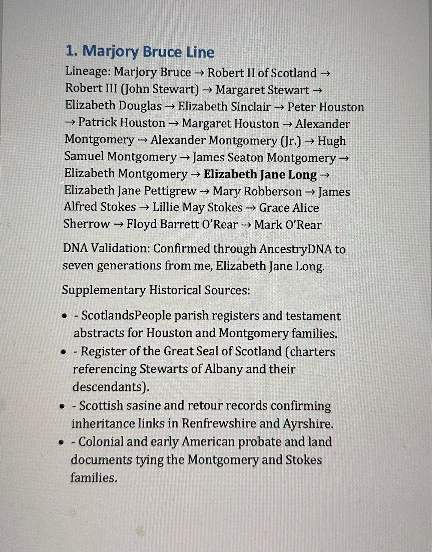 Our remarkable heritage is not only a testament to the strength of familial ties in early Scottish history, but also to the meticulous efforts of genealogists who have compiled extensive records. Supplemented by resources such as Ancestry.com and FamilySearch.com, the rest of the lineage beyond seven generations from me (again proven by DNA) stands fortified by published genealogies and credible sources, making this ancestral journey both fascinating and rare. Certainly my family has a lot to be proud of.