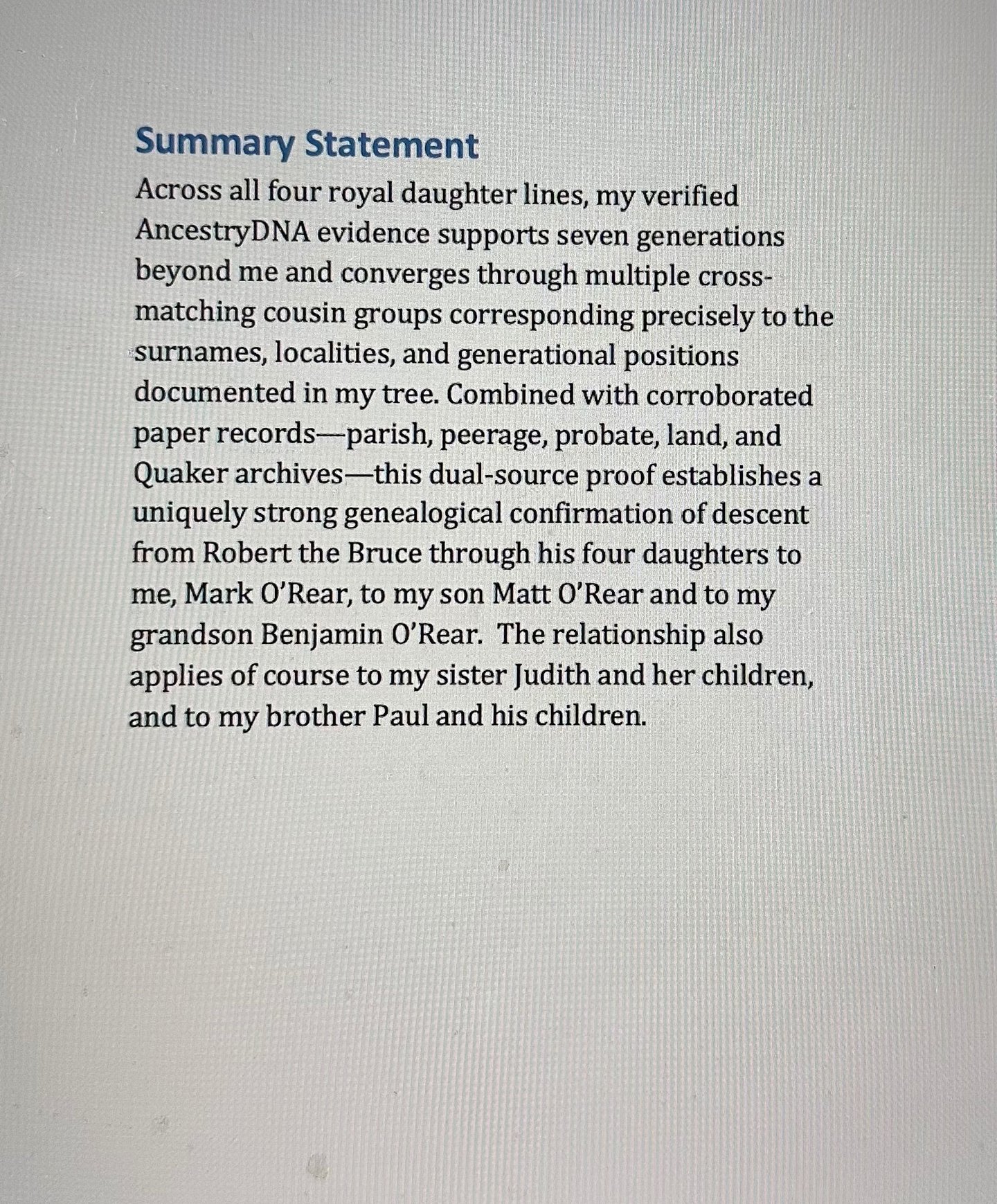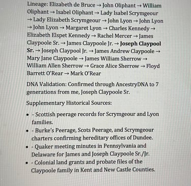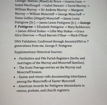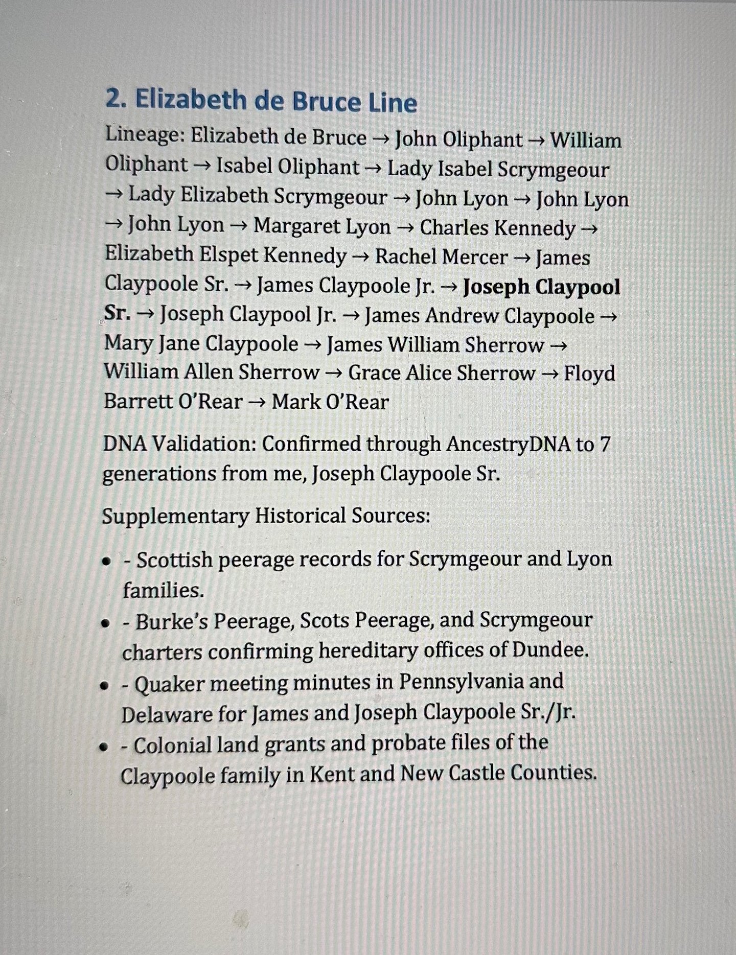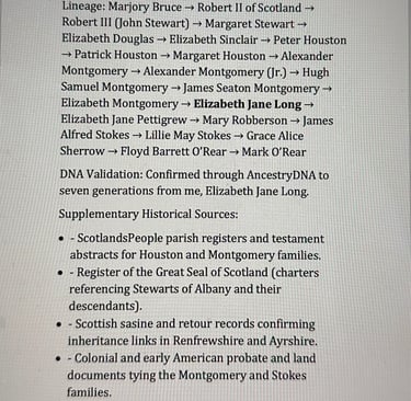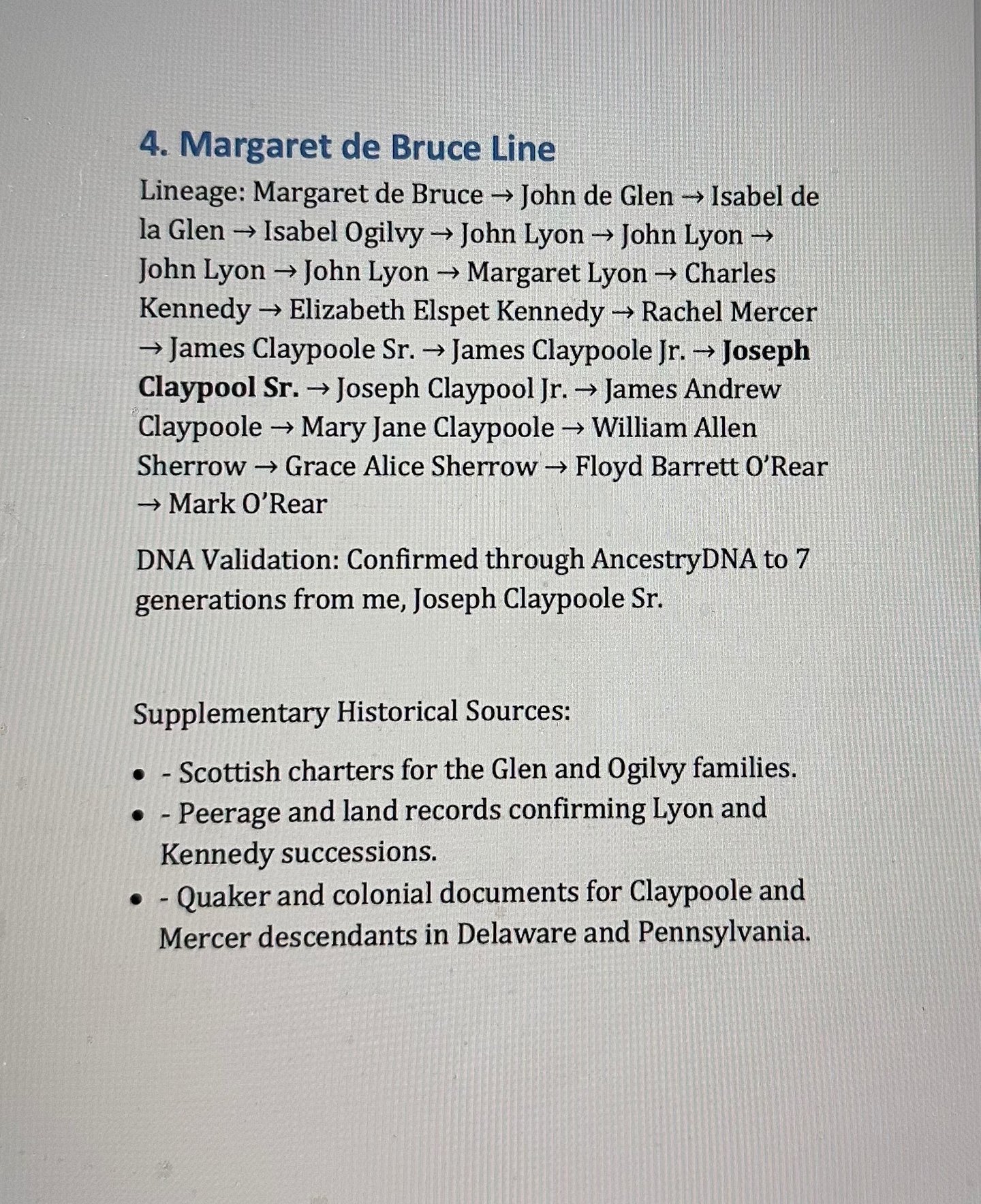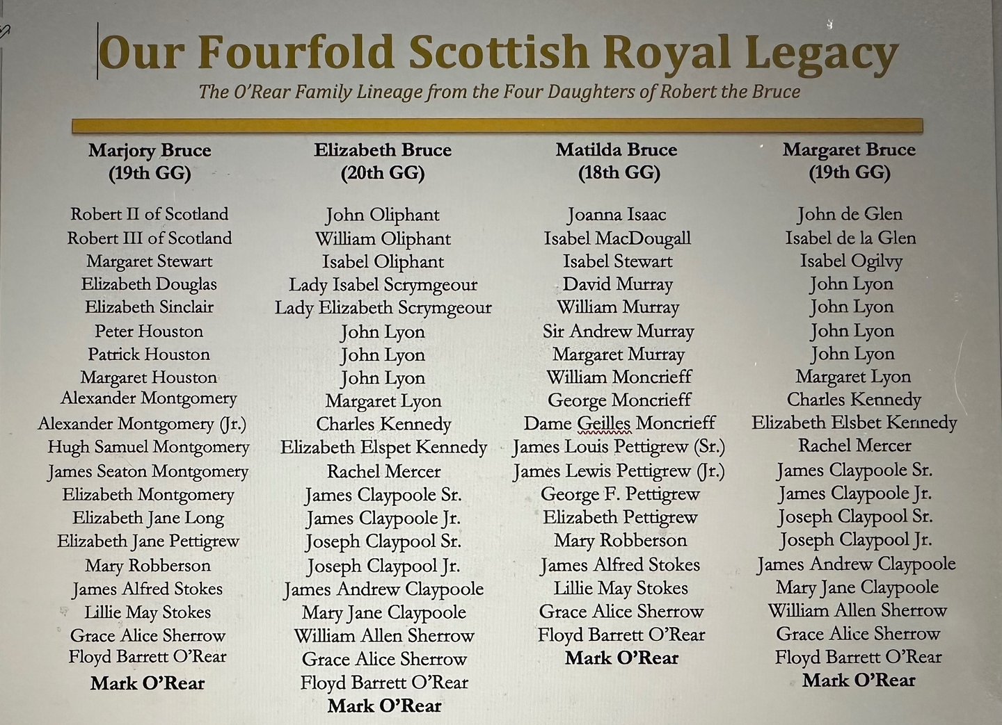 Our remarkable heritage is not only a testament to the strength of familial ties in early Scottish history, but also to the meticulous efforts of genealogists who have compiled extensive records. Supplemented by resources such as Ancestry.com and FamilySearch.com, the rest of the lineage beyond seven generations from me (again proven by DNA) stands fortified by published genealogies and credible sources, making this ancestral journey both fascinating and rare. Certainly my family has a lot to be proud of.