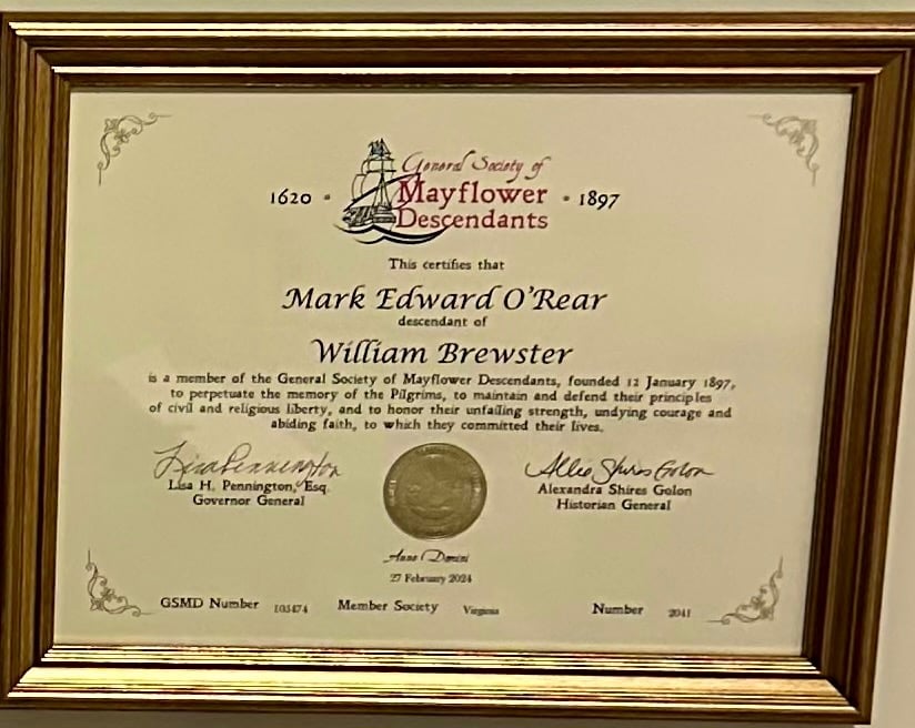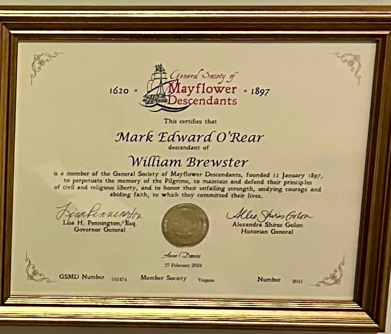 My first real ancestral discovery happened when I began to follow my Mom's (Virginia Beckman) roots. She grew up in Cambridge Massachussetts, and as I continued further into my Mom's line I discovered that her Boston roots went really far back. And I mean waaay back. I discovered that my 11th great grandfather was William Brewster, a highly influential spiritual leader and a key member of our Plymouth Mayflower founders. But discovering this on a web site is not enough proof, so I began to pursue the extremely difficult and arduous task of documenting our lineage for official Mayflower Society certification. This required finding and many times purchasing birth certificates, death certificates and marriage certificates starting with myself and my wife Janette, through my father Floyd Barrett O'Rear Jr. and my mother Virginia May Beckman, to her parents, and their parents, etc. etc. I was quite overwhelmed when I first learned how much proof and effort would be required, but I was retired, and I thought I could do it, so I dug in.